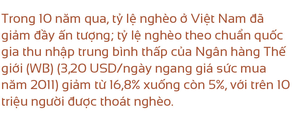 Theo TS Đặng Xuân Thanh, Phó Chủ tịch Viện Hàn lâm Khoa học xã hội Việt Nam: Trong thập kỷ qua, tỷ lệ nghèo đã giảm đầy ấn tượng. Tỷ lệ nghèo theo chuẩn quốc gia thu nhập trung bình thấp của WB (3,20 USD/ngày ngang giá sức mua năm 2011) giảm từ 16,8% xuống còn 5%, với trên 10 triệu người được thoát nghèo. Đại dịch COVID-19 xuất hiện đột ngột vào cuối thập kỷ đã làm ngưng trệ tiến độ tăng lương và cải thiện về chất lượng việc làm. Những tiến triển về giảm nghèo bị lùi lại nhưng không bị đảo ngược trong năm 2020.