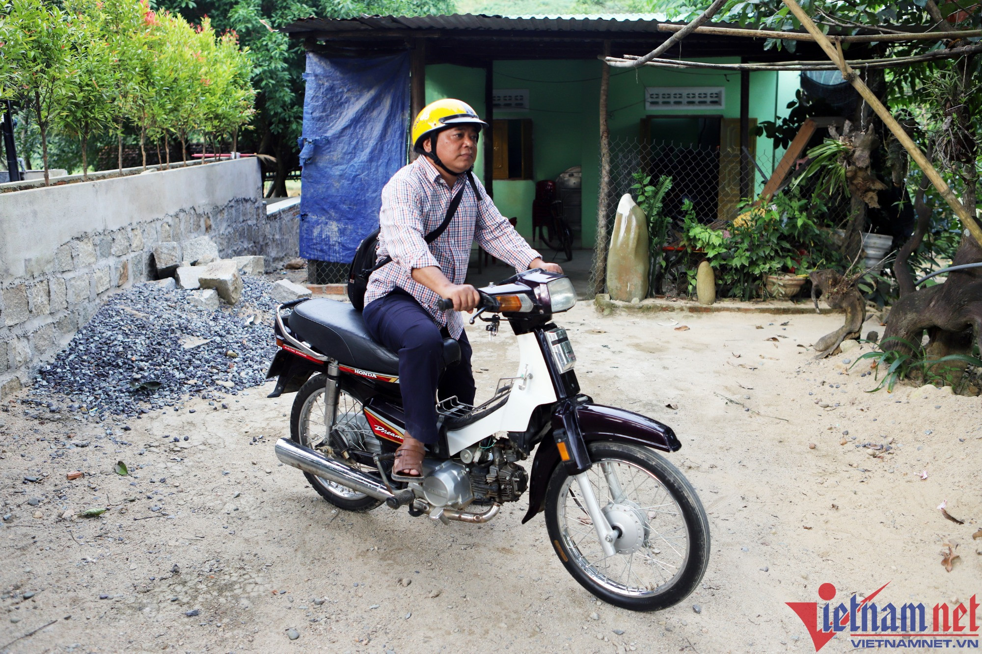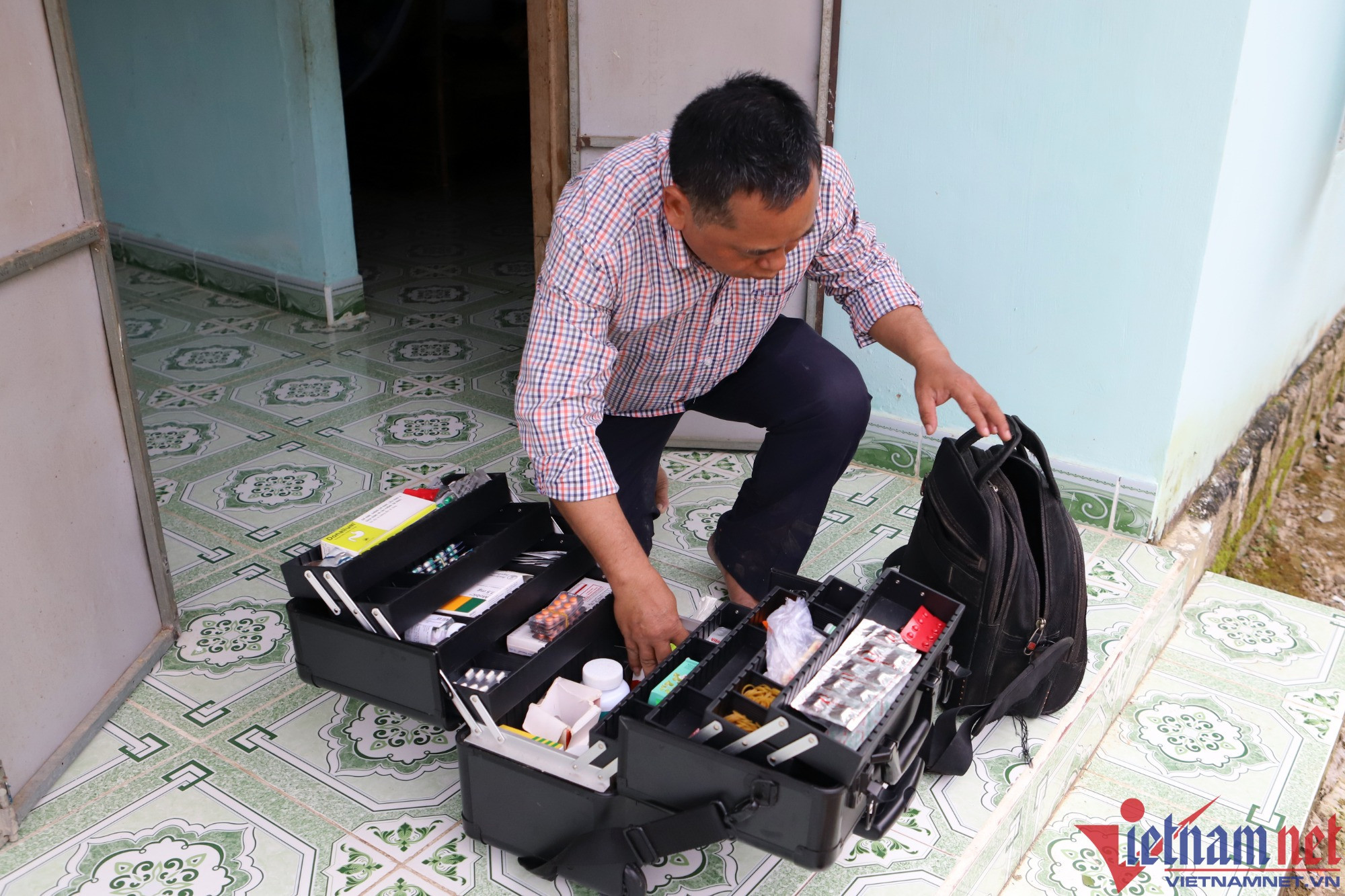 Thay vội bộ quần áo, kiểm tra vali xếp đầy ắp các loại thuốc và chiếc túi chứa dụng cụ y tế ông Phi lên chiếc xe Dream cũ, phóng đi.