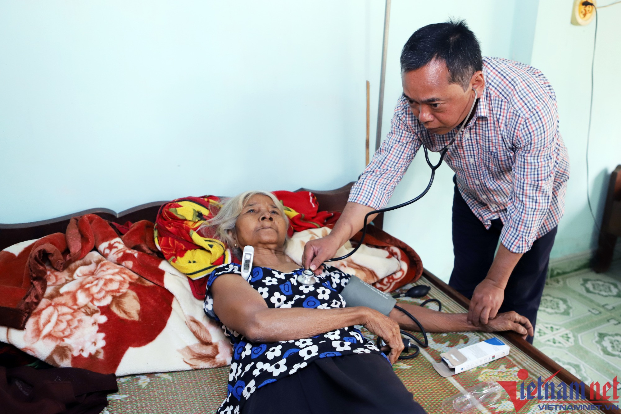 Ở gần đó, hay tin ông Phi khám bệnh cho hàng xóm, bà Cao Thị Mà Lý, 45 tuổi, liền sang nhờ kiểm tra sức khỏe cho mẹ ruột của mình. Căn nhà rộng chừng 40m2 của họ trông tuềnh toàng, bên trong chỉ vỏn vẹn vài thứ gia dụng cần thiết, chiếc tivi nhỏ góc tường cùng tủ lạnh có thể là thứ quý giá với gia đình này.