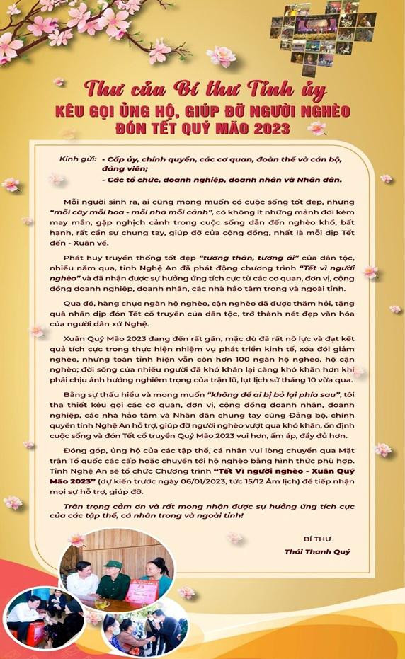 Mới đây, Bí thư Tỉnh ủy Nghệ An Thái Thanh Quý đã có Thư kêu gọi các cơ quan, đơn vị, cộng đồng doanh nhân, doanh nghiệp, các nhà hảo tâm và Nhân dân phát huy truyền thống tương thân tương ái, chung tay cùng Đảng bộ, chính quyền tỉnh hỗ trợ, giúp đỡ người nghèo vượt qua khó khăn ổn định cuộc sống và đón Tết cổ truyền của dân tộc vui vẻ, ấm áp, đầy đủ và hạnh phúc hơn.